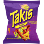 Barcel Takis Fuego are thin, tube-shaped tortilla chips that are rolled tightly and covered in a bold and spicy seasoning. The chips are known for their vibrant red color, which matches the fiery flavor profile they offer. The seasoning is a combination of hot chili pepper, lime, and a mix of other spices that contribute to their zesty and tangy taste.