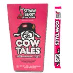 Cow Tales Strawberry Smoothie 28g is a chewy candy snack stick made of strawberry smoothie flavored filling and covered with a layer of white chocolate. It is made with the following ingredients: wheat flour, corn syrup, sugar, hydrogenated vegetable oil (palm kernel oil, soybean oil), strawberry puree, skim milk, whey, cream, modified whey, natural and artificial flavors, soy lecithin, salt, citric acid, and FD&C Red 40 Lake. It is 28g in weight and has a sweet and tangy flavor, with the st