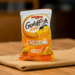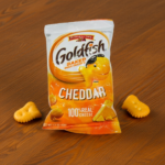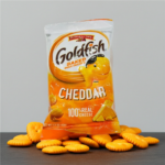 Goldfish Cheddar Crackers are a 42.5g pack of crispy, baked cheddar-flavored crackers shaped like goldfish.
